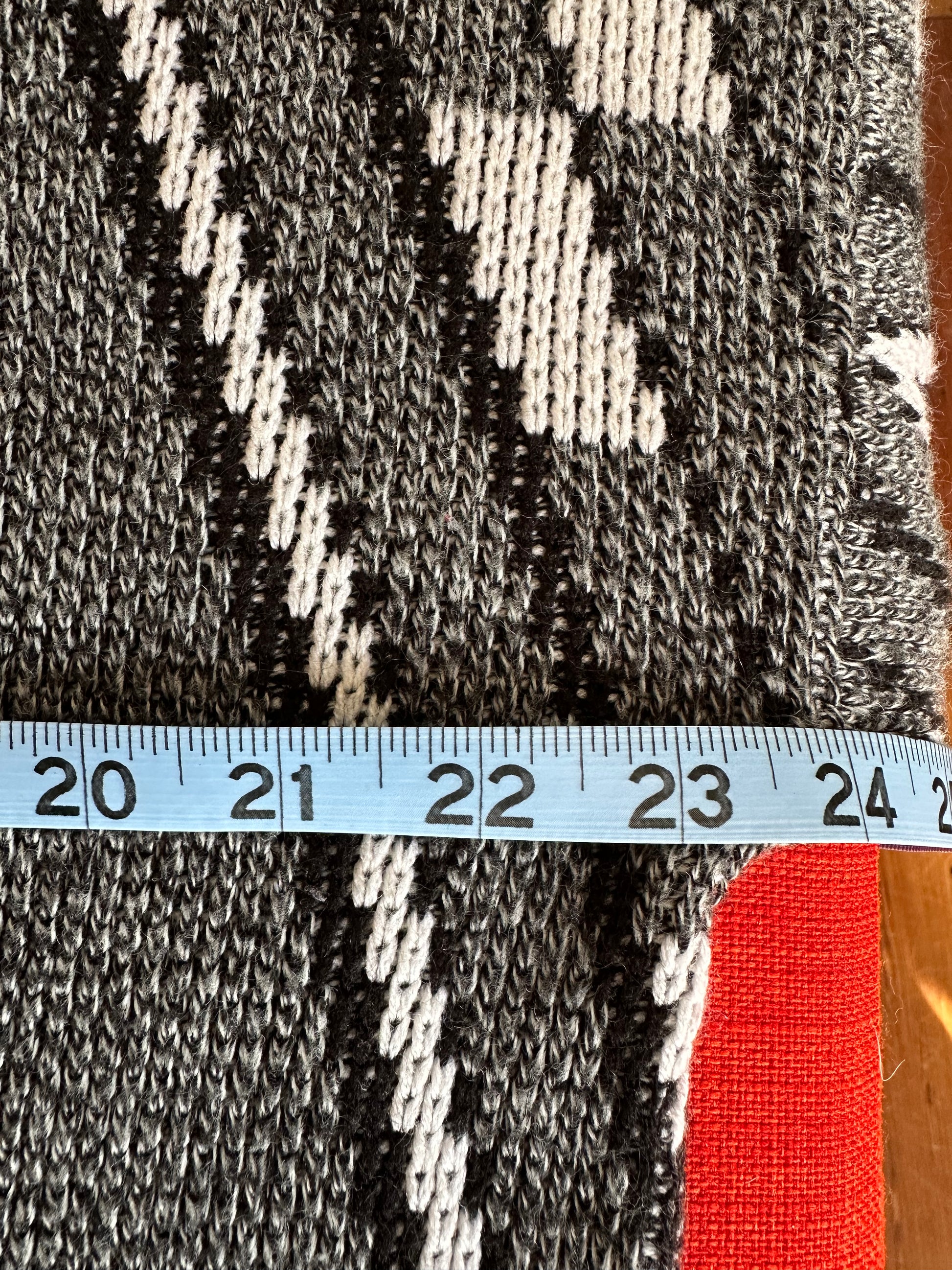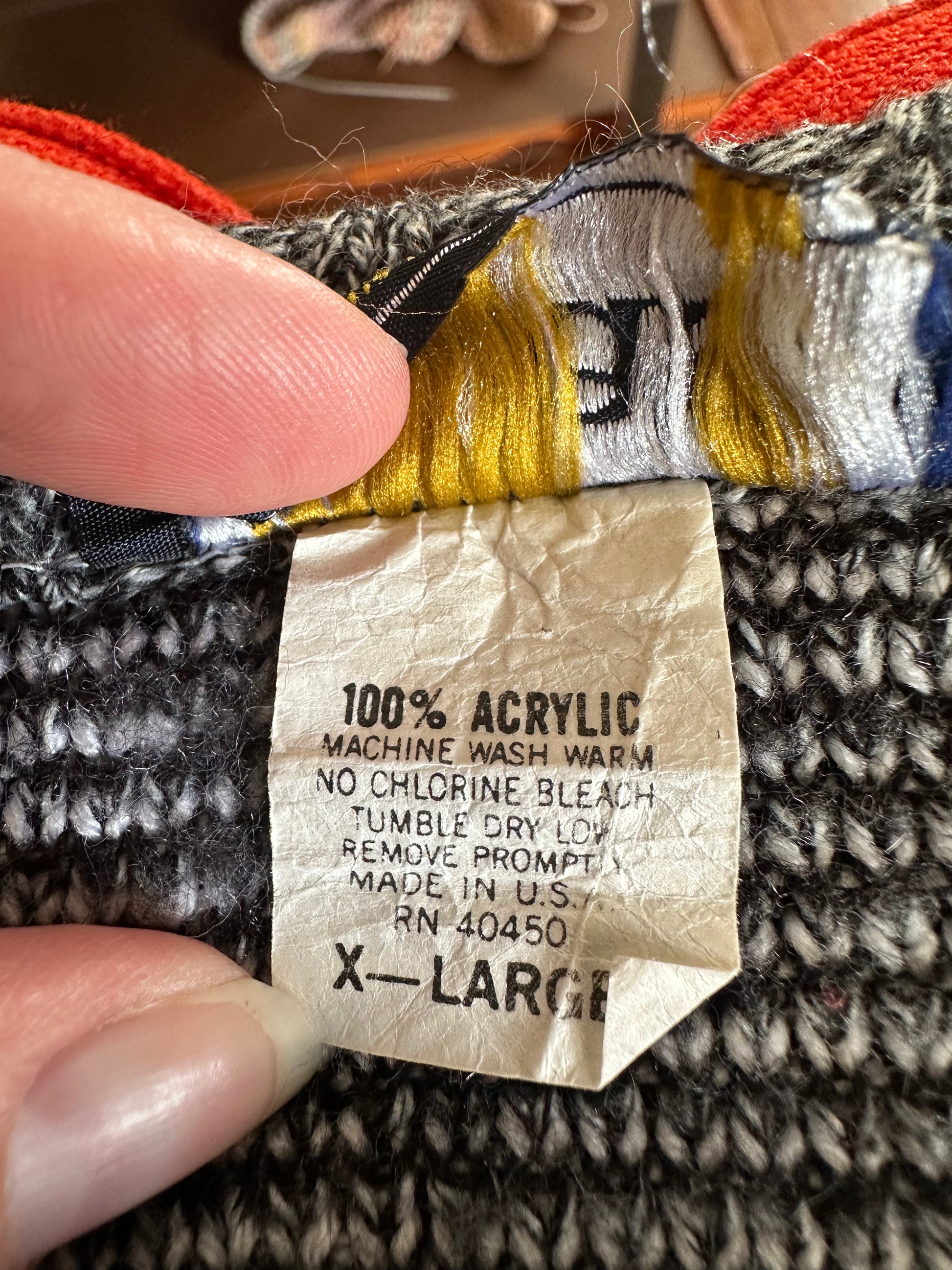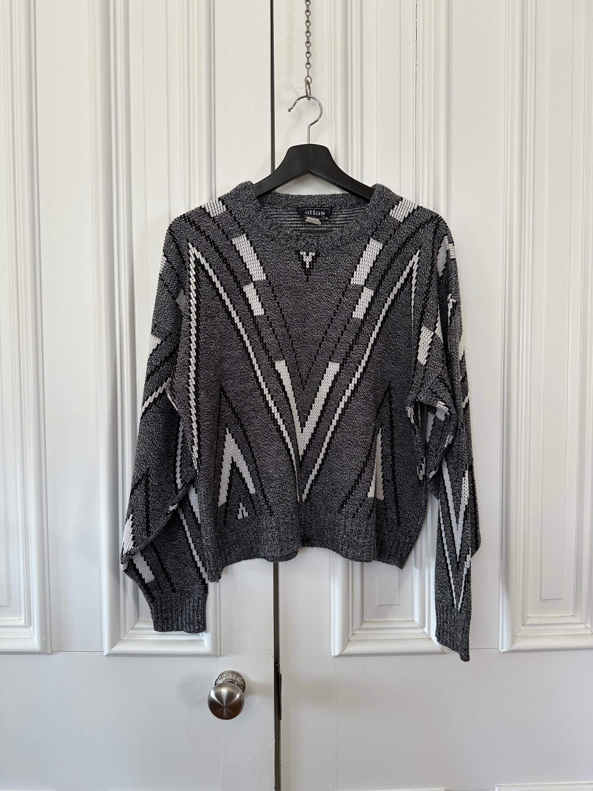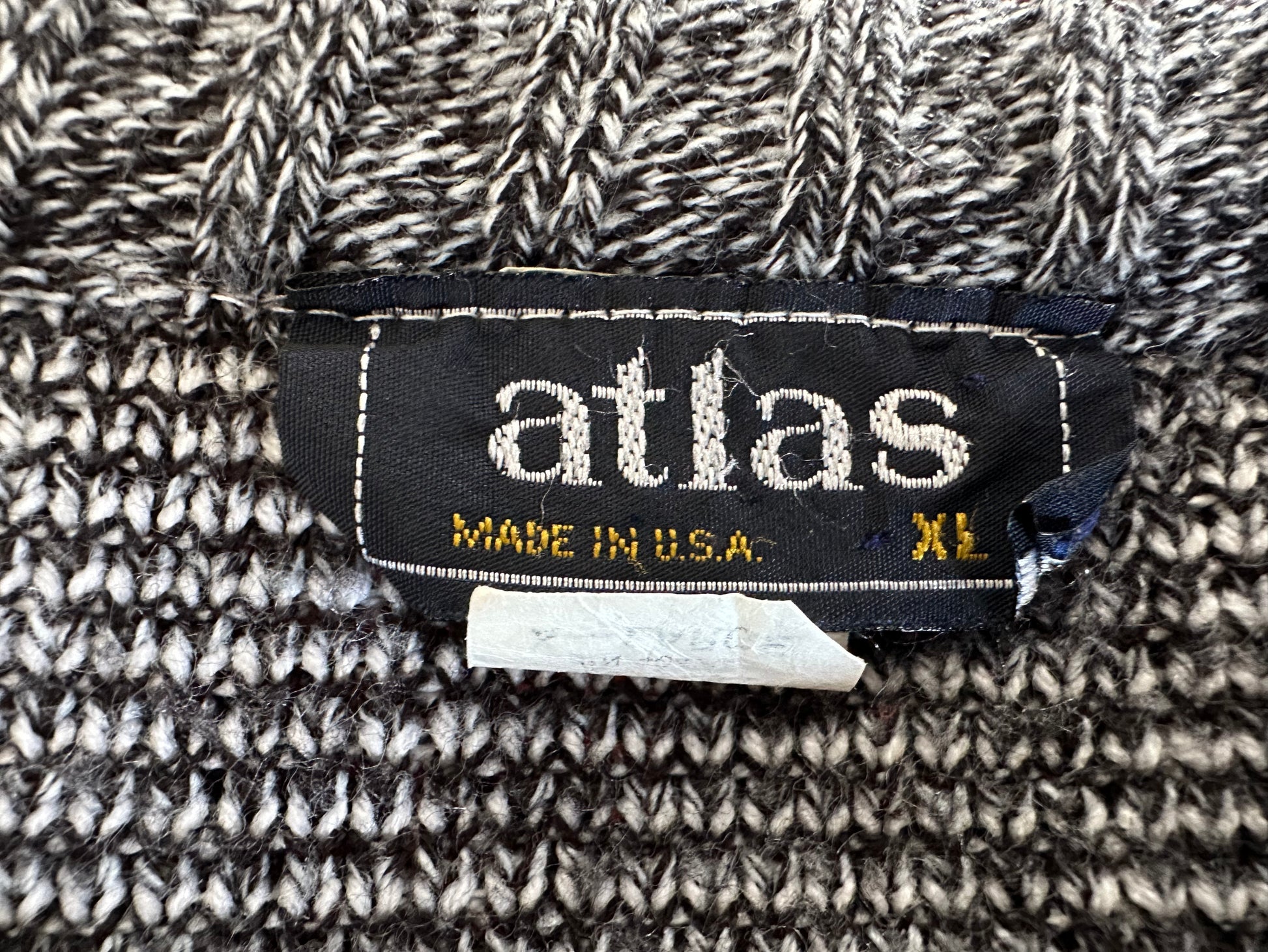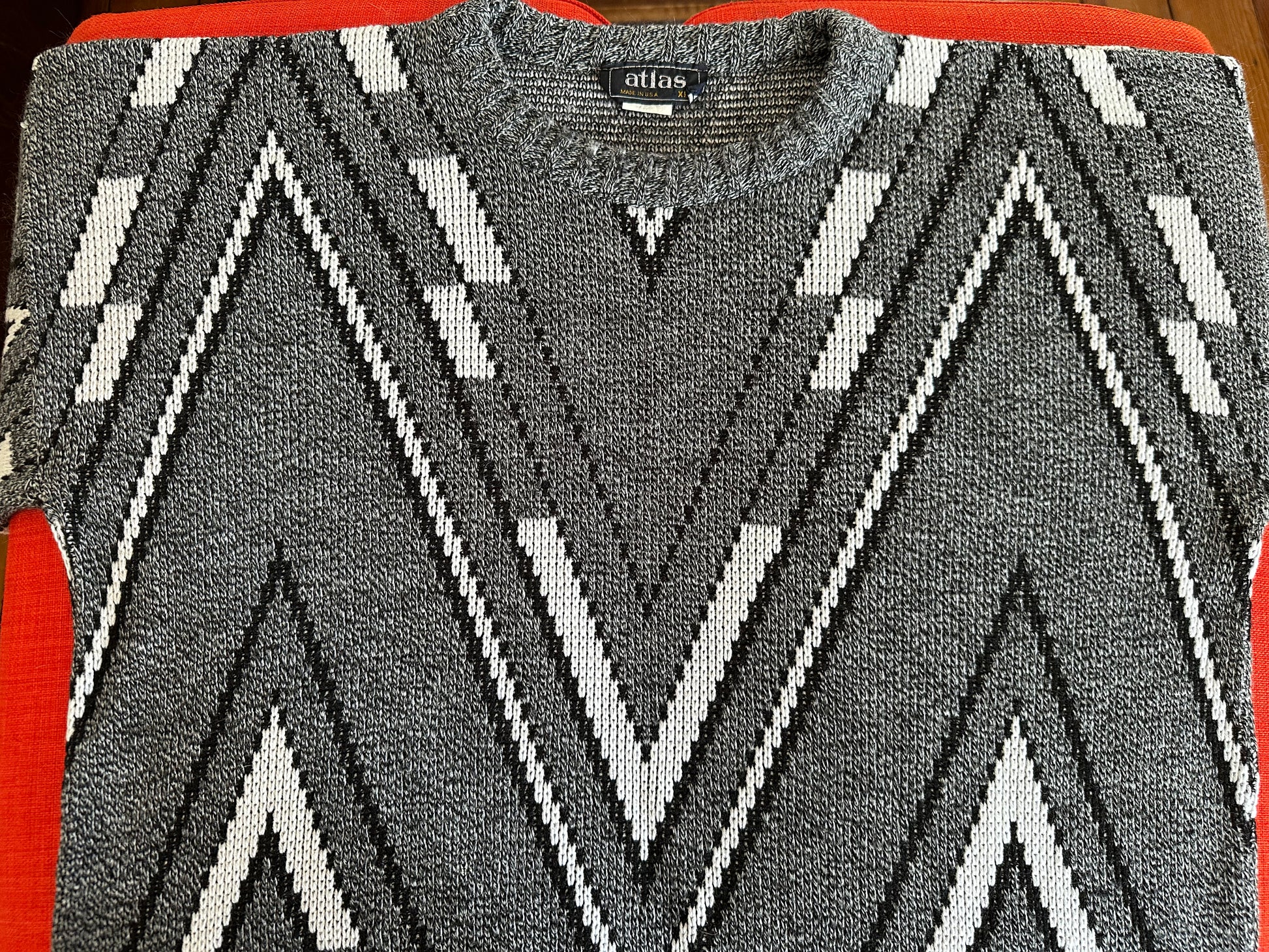 This 1990s sweater from Atlas has a hip-hop flavor and is cut to sit at the hip with a roomy, boxy fit. It's a vintage XL which means more like a M/L today. It's in excellent condition with no signs of obvious wear (but it's 30+ years old so it's not perfect). I love the chevron pattern here and almost kept it for myself.