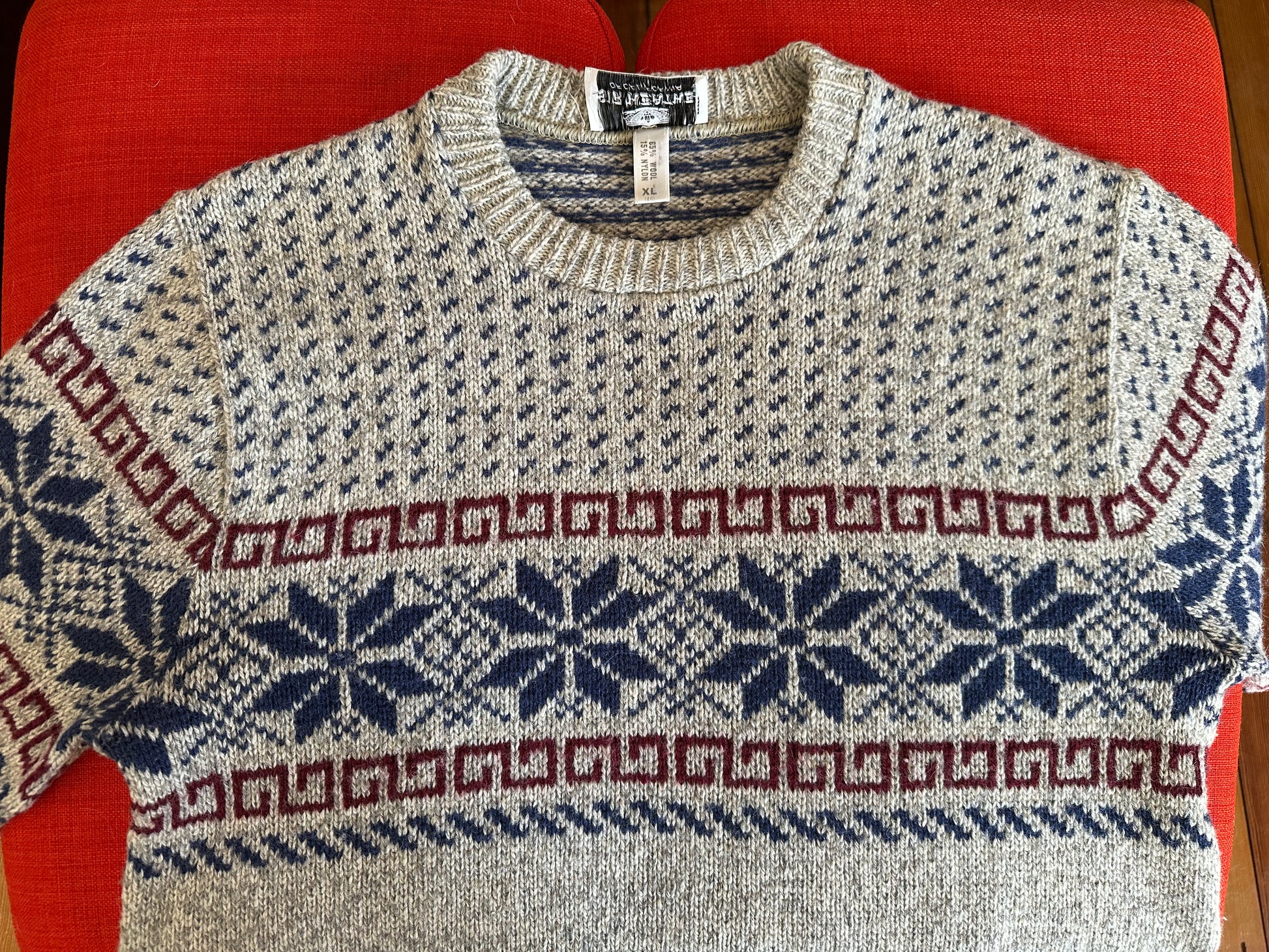 This vintage wool sweater comes from Sir Heathe of California. Estimated to be from the late 1960s or early 1970s, it is 85% wool and 15% nylon (likely in the patterned part of the knit). It is an oatmeal color with a dark red and dark blue Norwegian snowflake pattern. About a size medium, 20" seam-to-seam in the shoulder and 44" around the waist/hip.