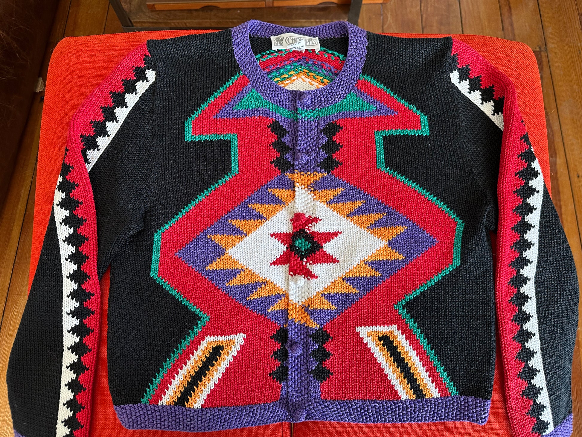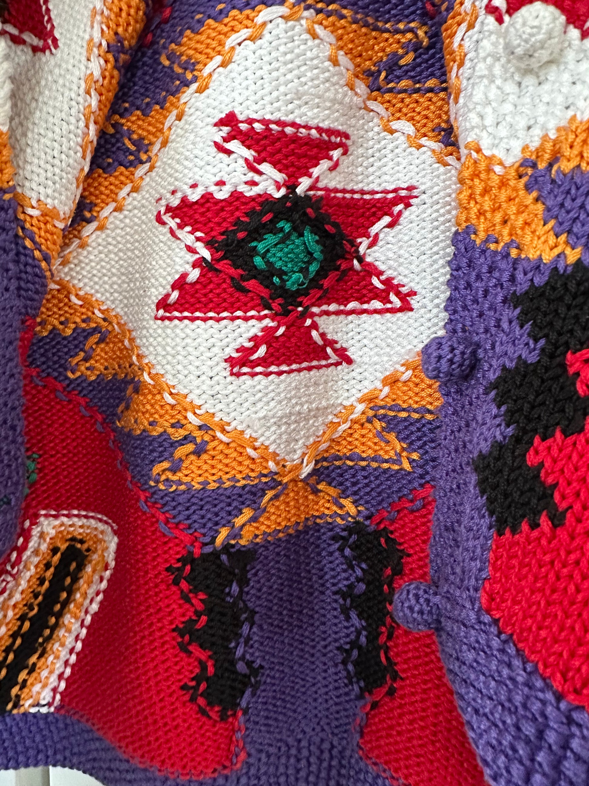 I can't say enough about how gorgeous this sweater is. Chompas is both the style, originating from Peru, as well as the maker (see photo of label). It is made in a beautifully soft cotton knit, with an impeccably worked patter in black, red, yellow, purple, green, and white. It is labeled size S but measures 36" across the waist (armpit to armit) so would probably fit a medium. It is a cropped cardigan cut with buttons covered in matching knit.