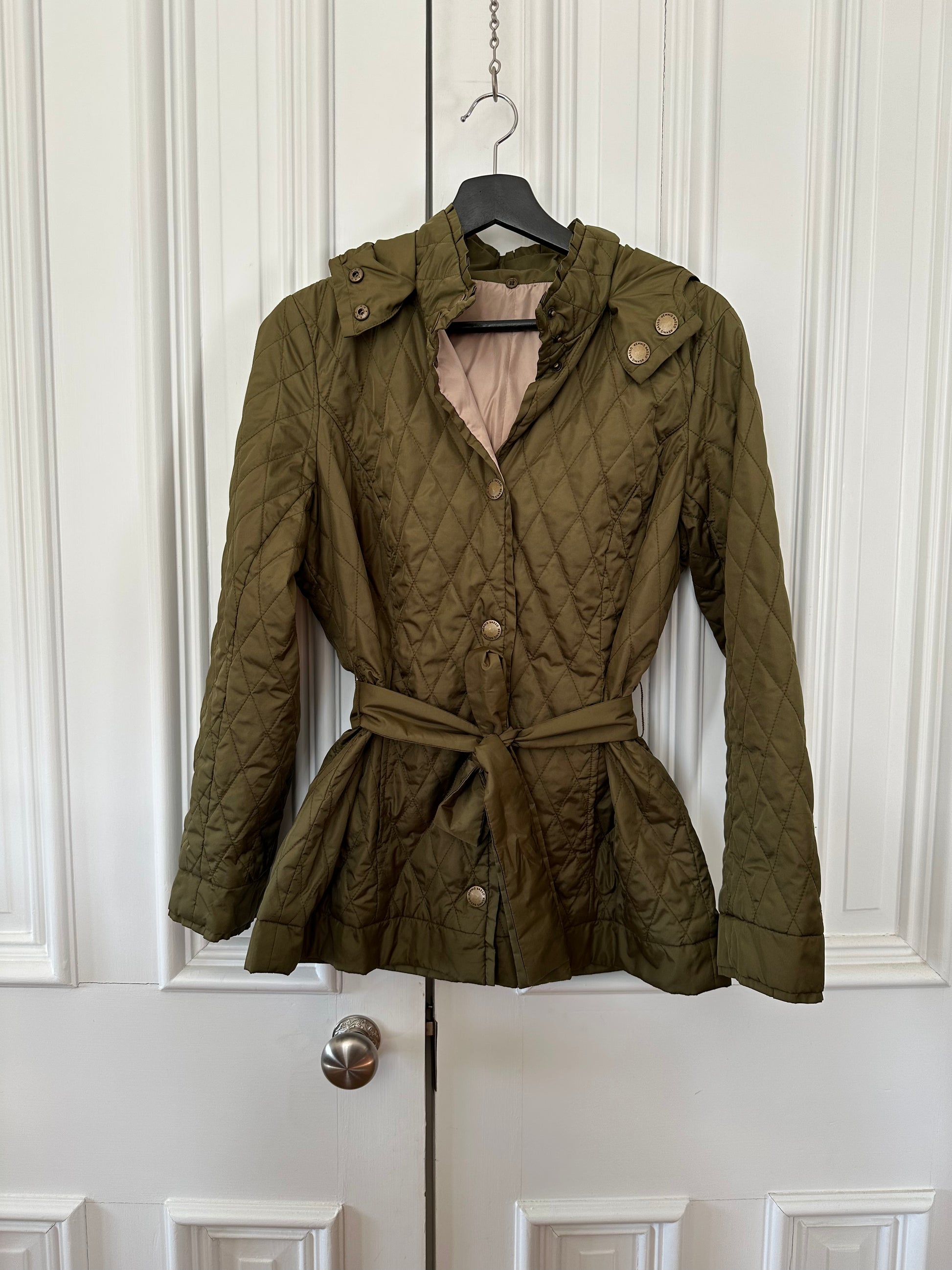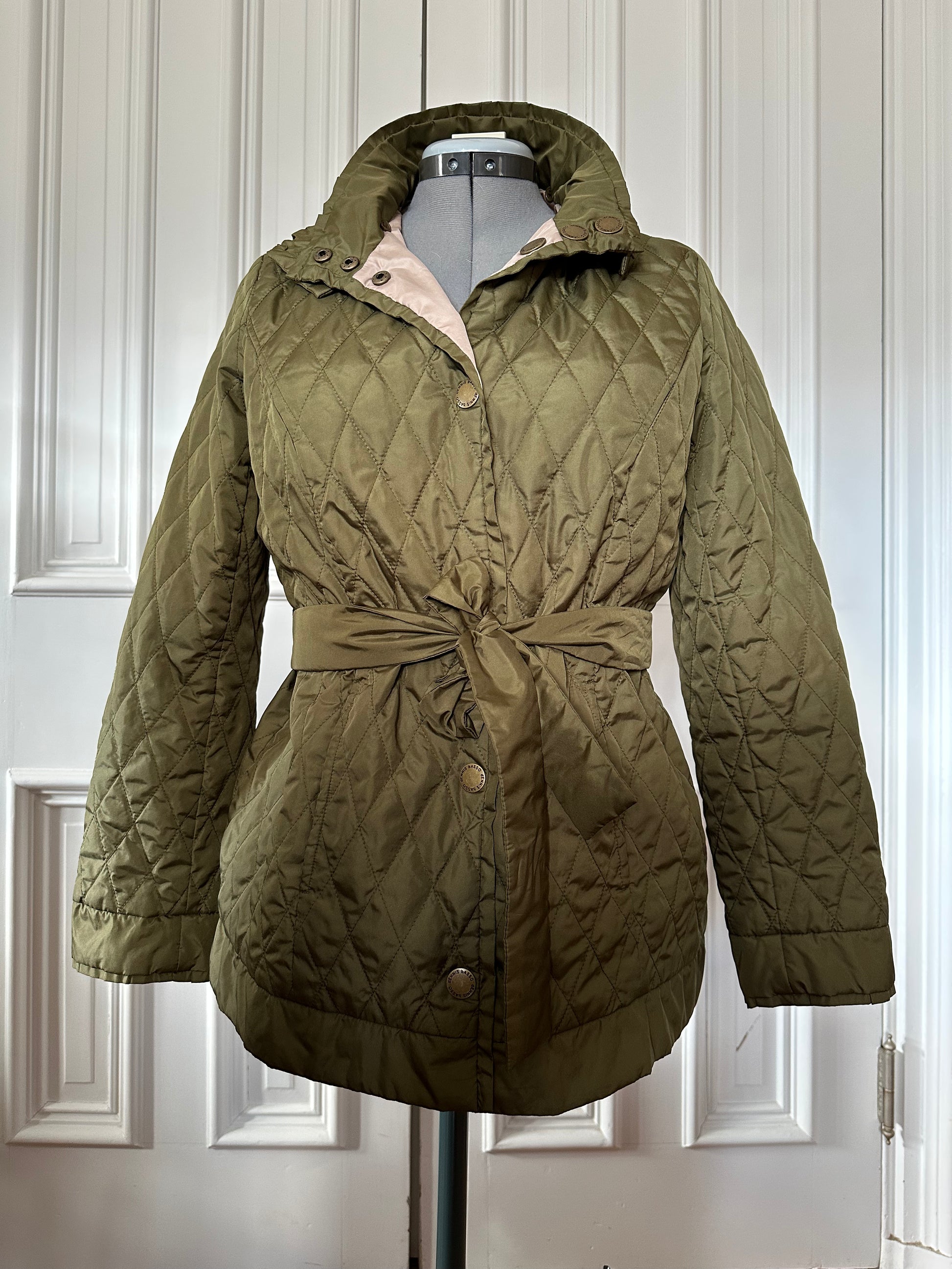 This loden-green quilted jacket is understated, sophisticated, and practical. The details are beautifully attended to, including finishes on seams and rivets. It comes with a removable hood. This jacket would look at home walking the foggy English countryside or grabbing coffee at the farmer's market.
