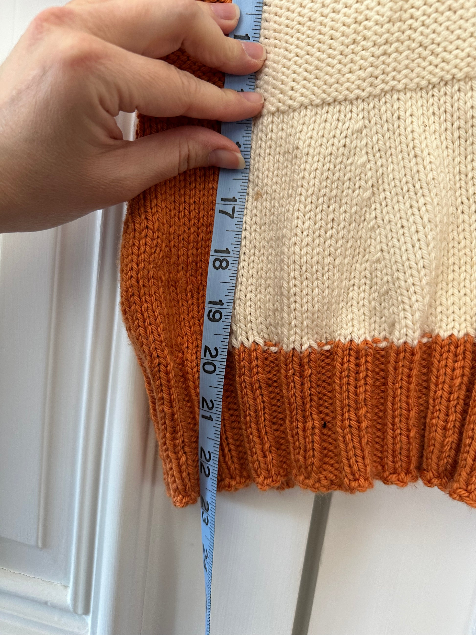 This sweater was handknit in a merino wool in shades of cream and orange. It was knit with shaping to accentuate the waist, and a ribbed V neck collar, waistband, and cuffs. It will offer a retro style to any outfit. It is about 28" in the waist, which would make it a size small.