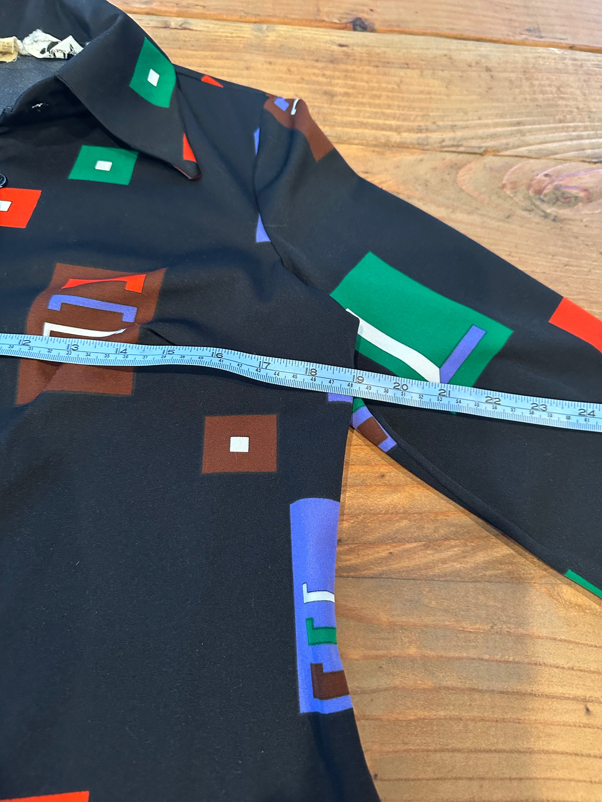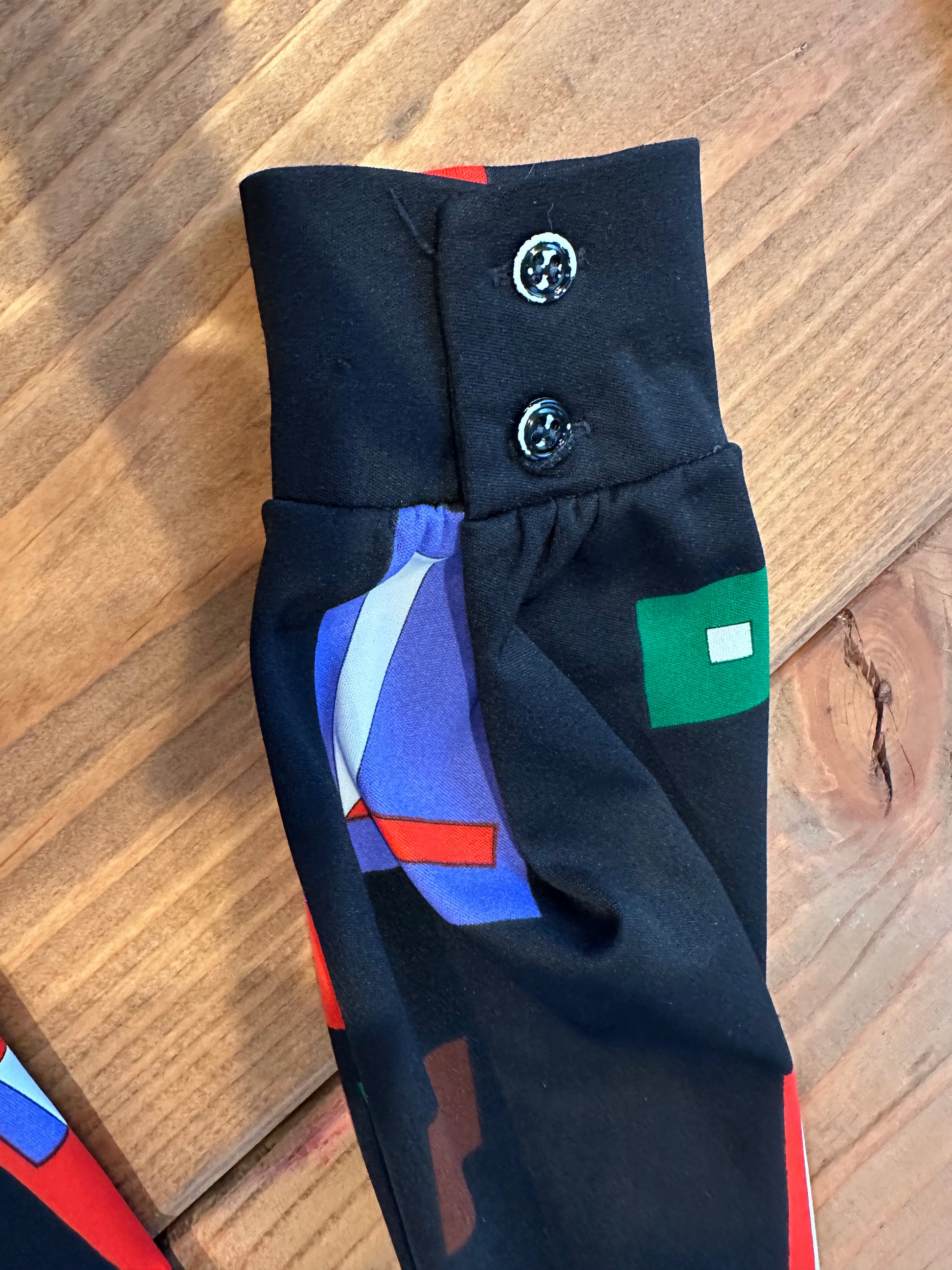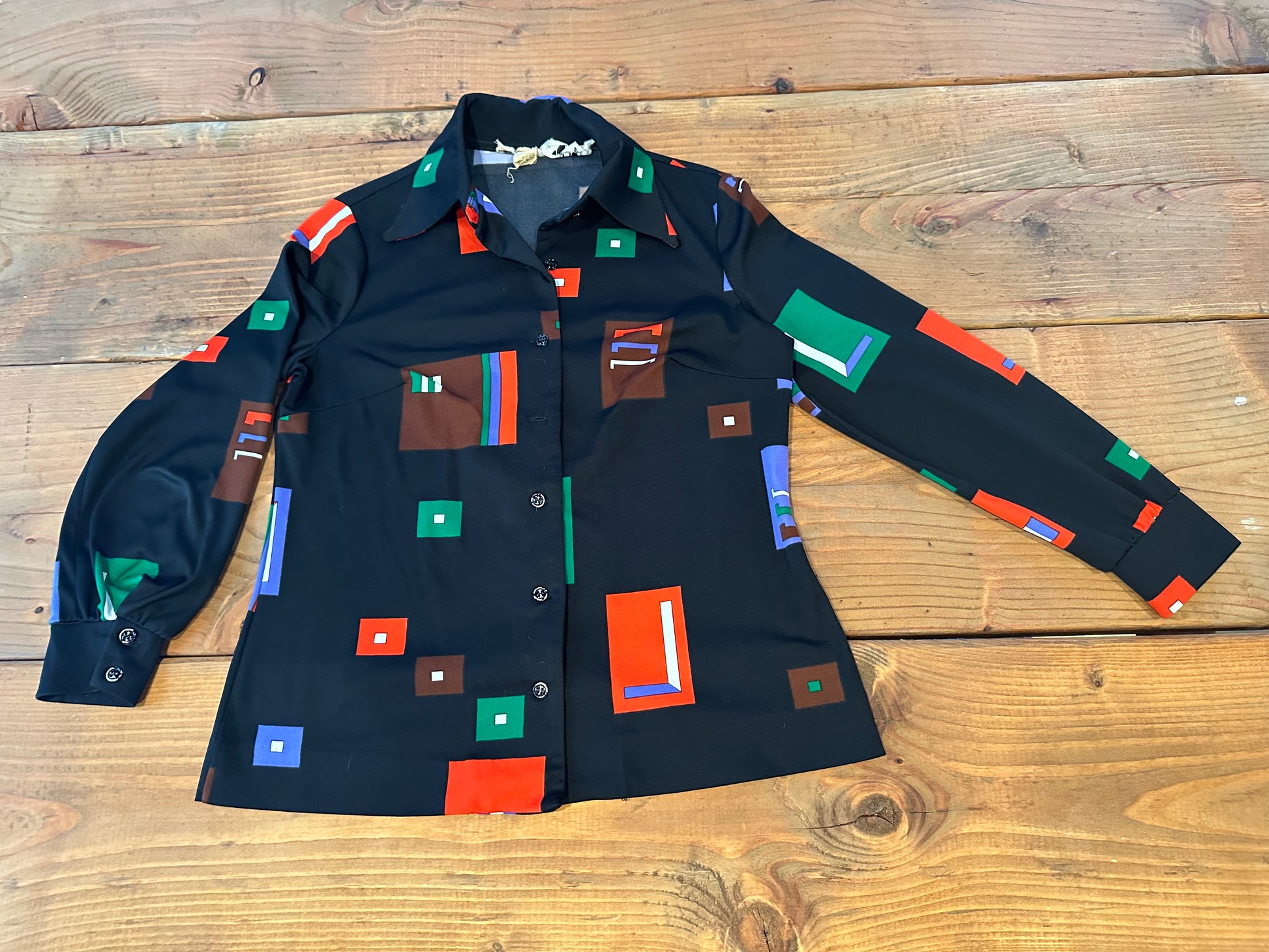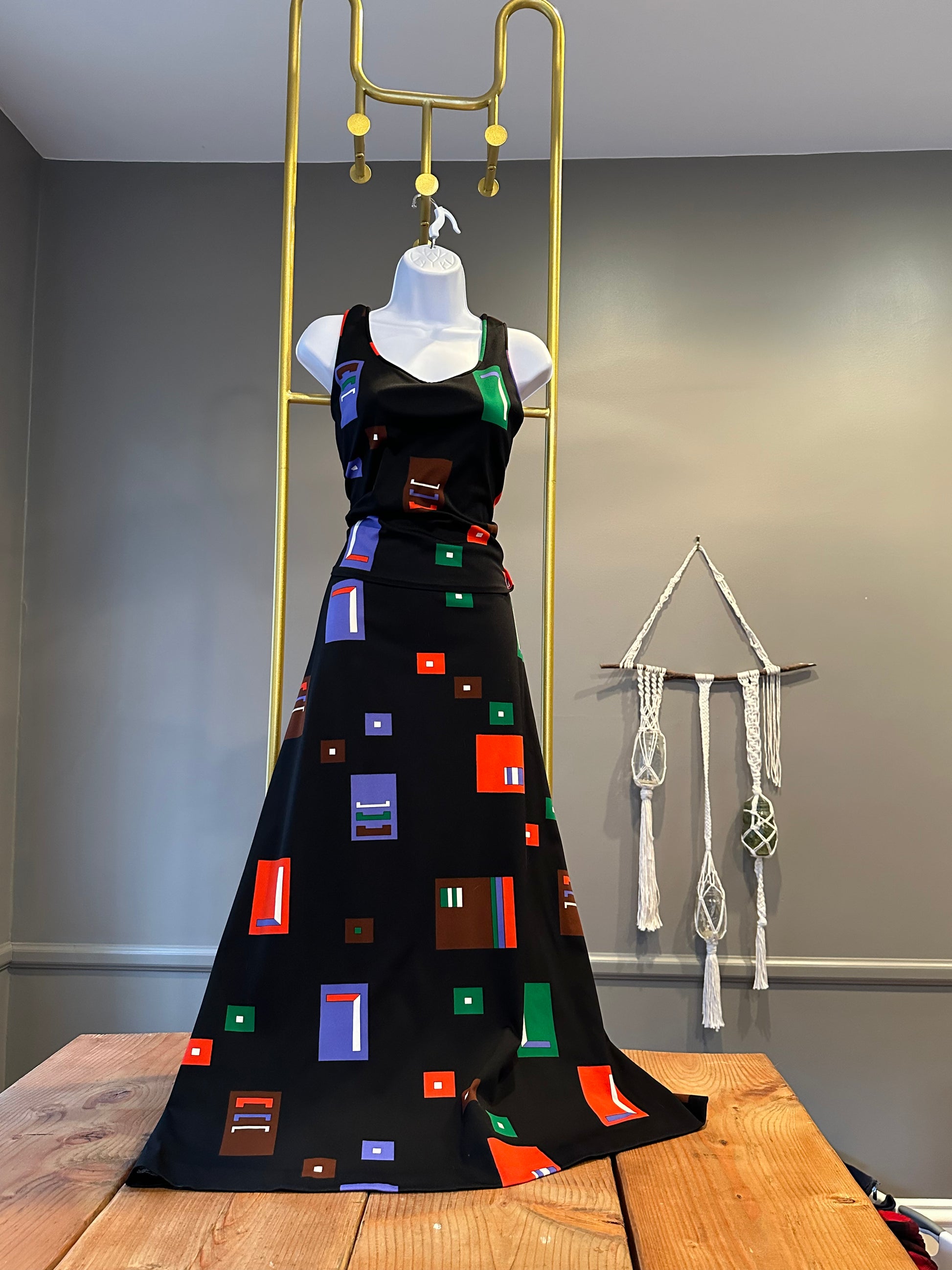 Make a bold statement in this stunning vintage 1970s Jonathan Logan three-piece set. Featuring an abstract geometric print in vibrant blocks of red, green, violet, brown and white on deep black, this silky polyester set speaks to the style of the time. The set includes a long-sleeve blouyse with sharp pointed collar and button cuffes; a sleveless tank top with a scoop neckline; and a sweeping A-line maxi skirt with a flattering high waist and zip closure. the skirt is beautifully finished with floral trim.