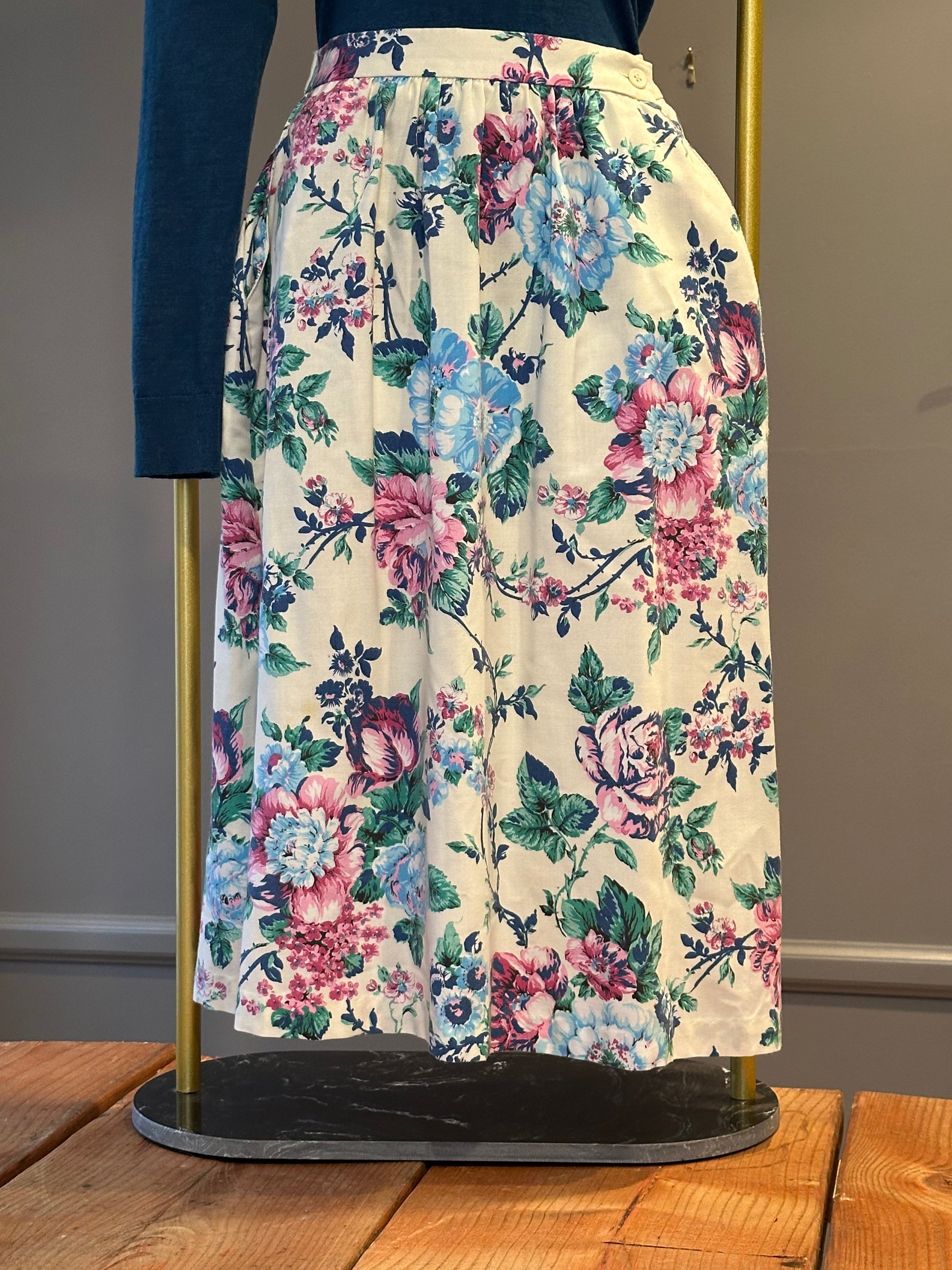 Step into timeless charm with this authentic late 1980s Cricket Lange midi skirt, a JCPenney house brand known for their playful juniors fashions. Made in the USA, this high-waisted skirt features a vibrant floral print in shades of magenta, blue and green on a white background. it is 100% cotton and has a pleated front - with pockets!!! Perfect for your cottagecore or prairie vintage styles or pair with a fitted tee, granny square sweater, or flowy blouse. Wear this to a picnic at a lavender farm or to an outdoor tasting at a vineyard.