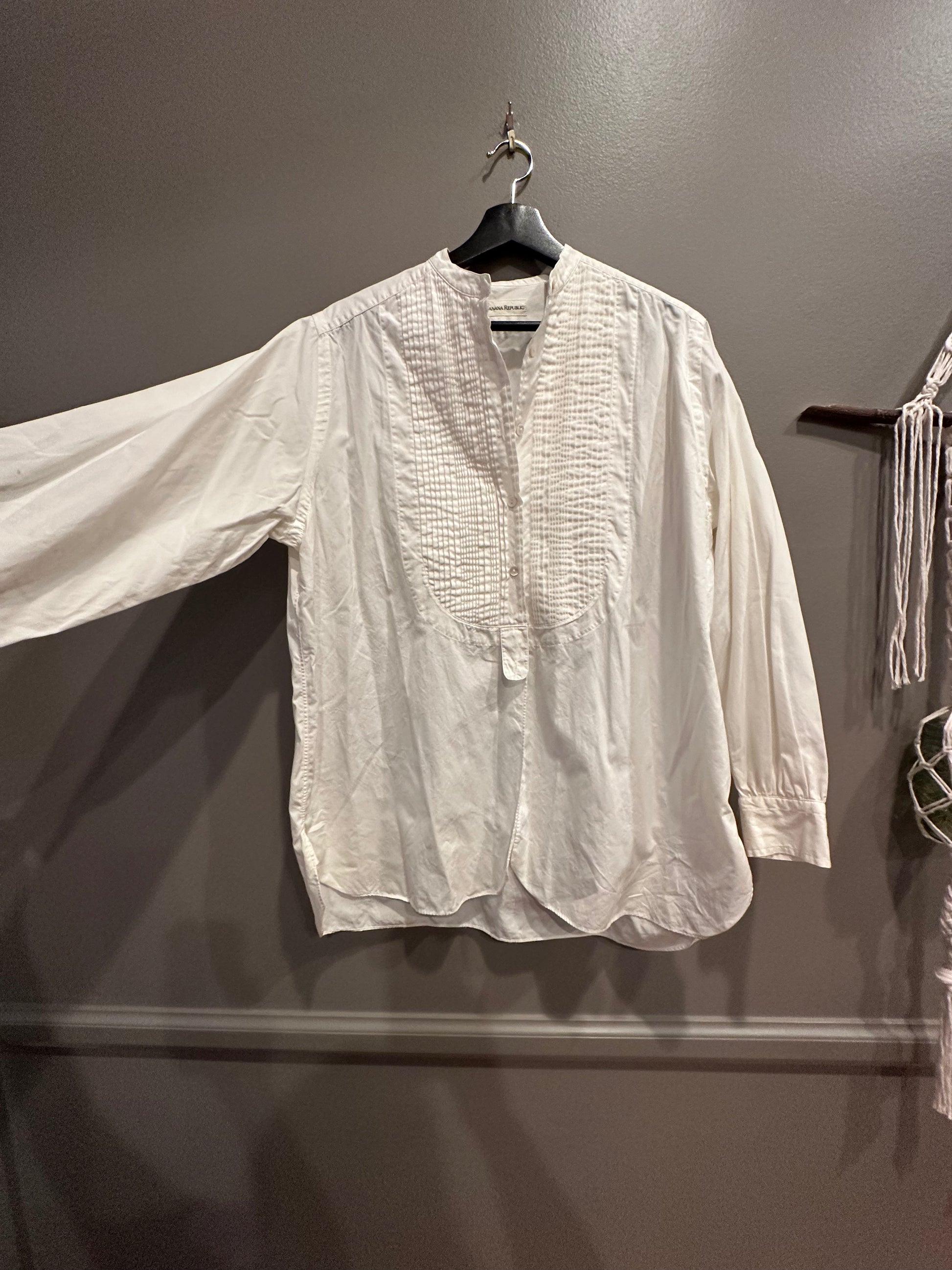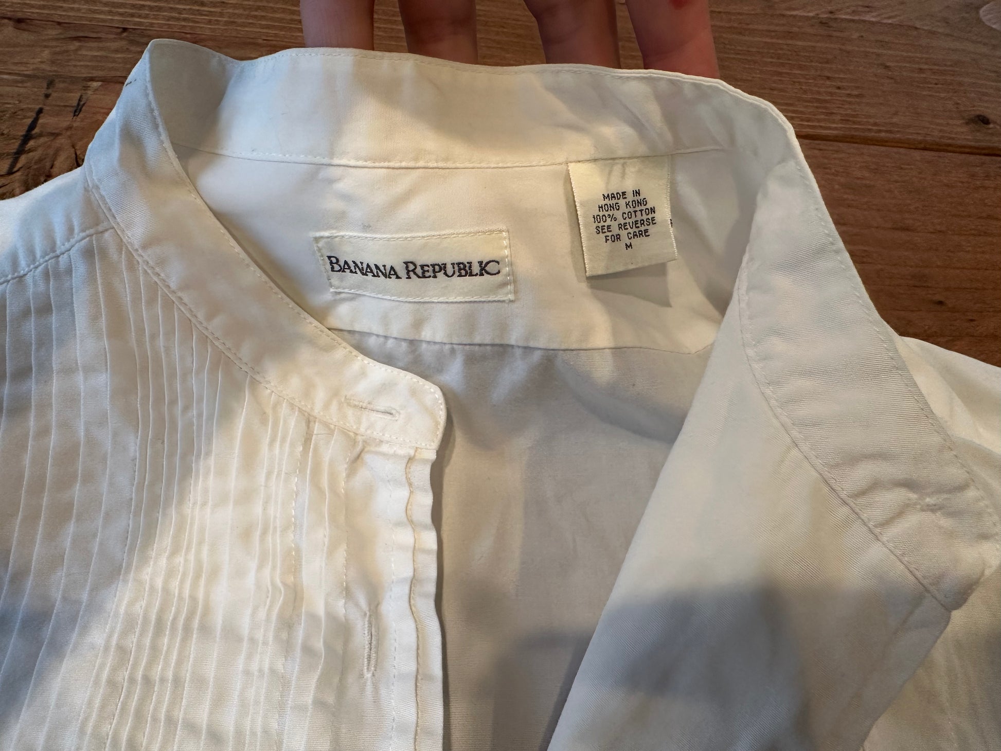 Crisp and timeless, this Banana Republic blouse features a tuxedo-style pintuck bib front and elegant band collar. It was made in Hong Kong from 100% cotton. This shirt may have been part of a men's formalwear line (it has a tab for a cummerbund); or it may have been men's-wear-inspired. Either way, it's an amazing 1990s addition to your wardrobe. Wear tucked into your favorite high-waisted skirt or loose over wide-leg jeans or flowy trousers.