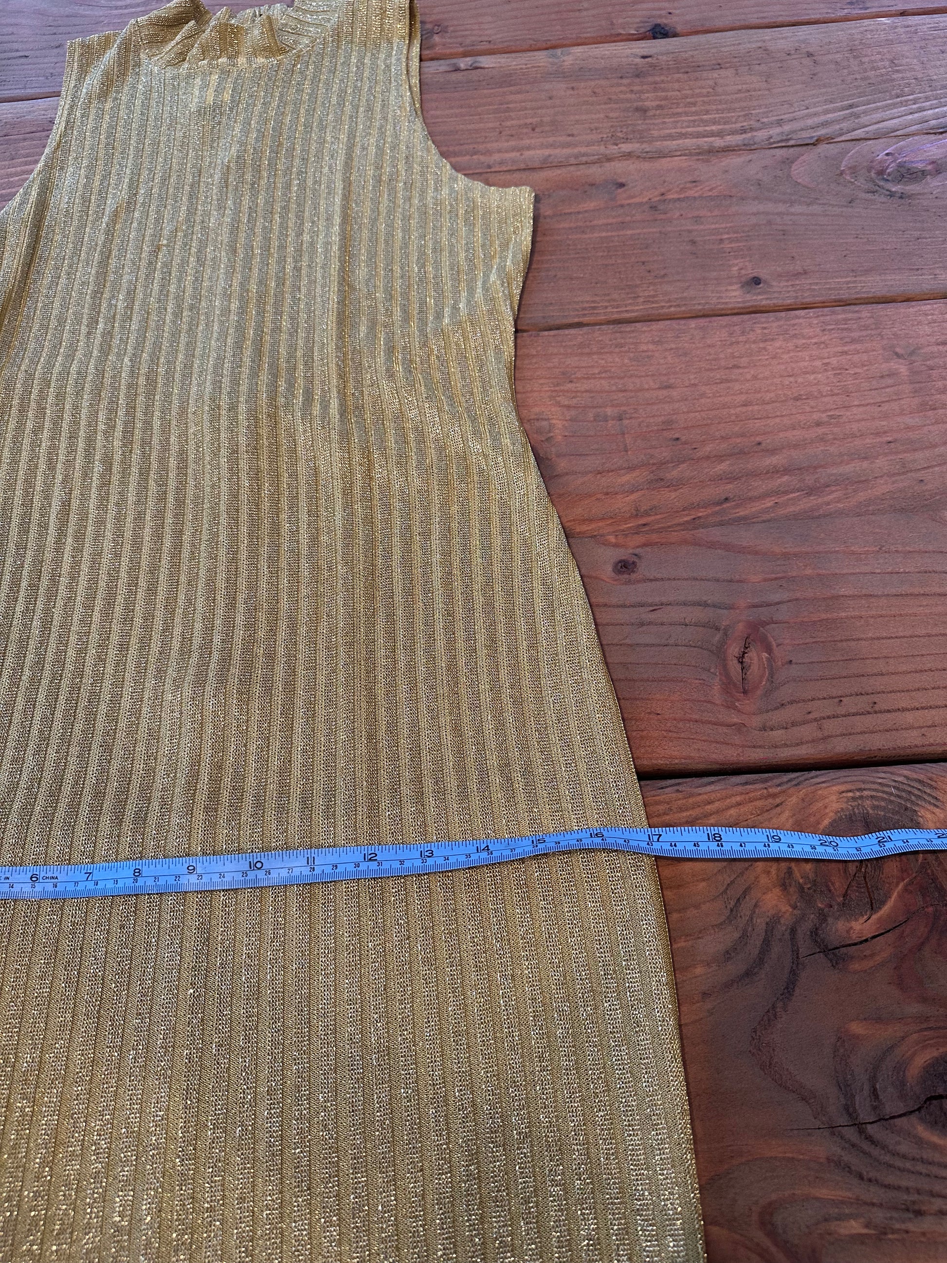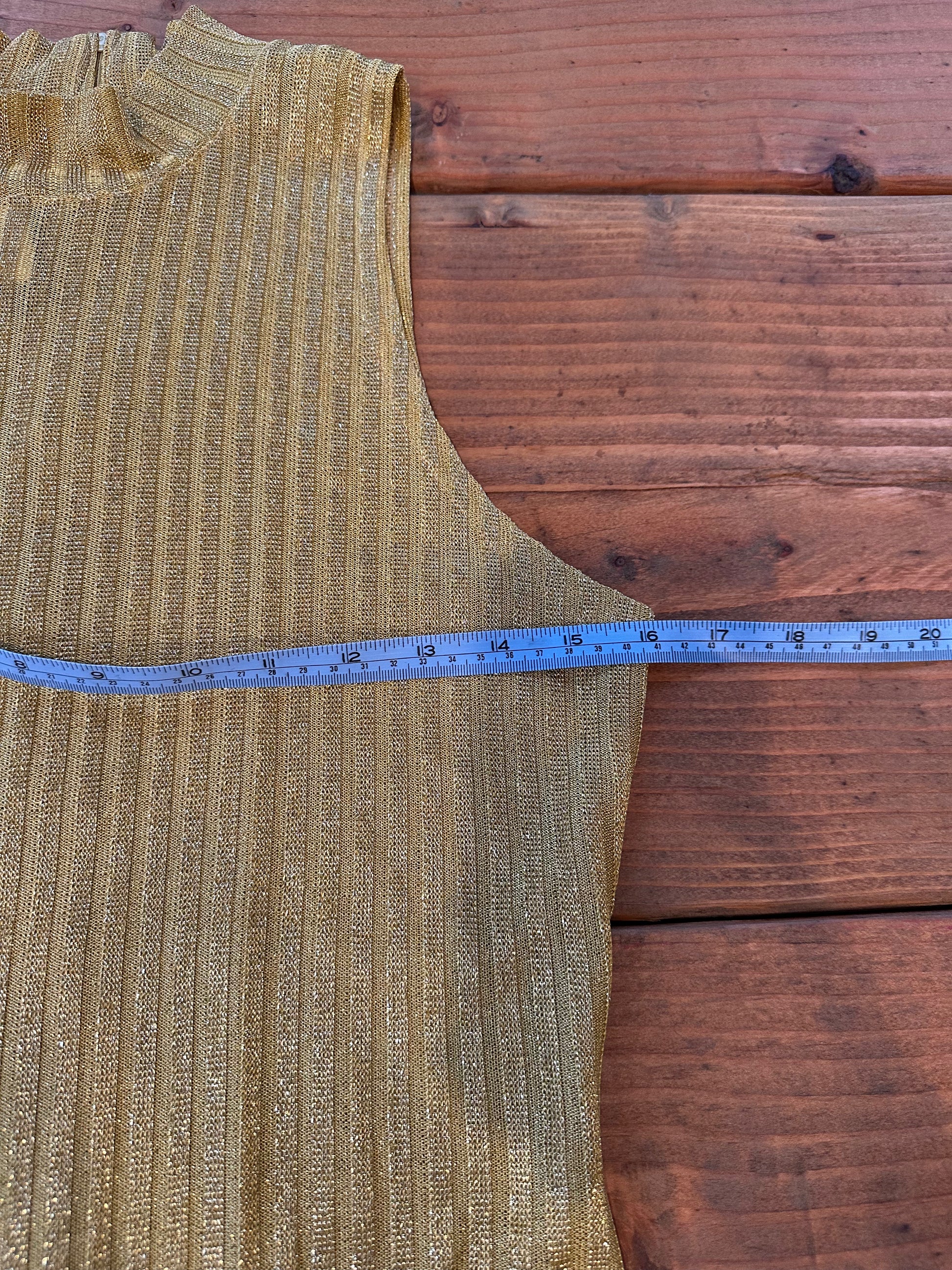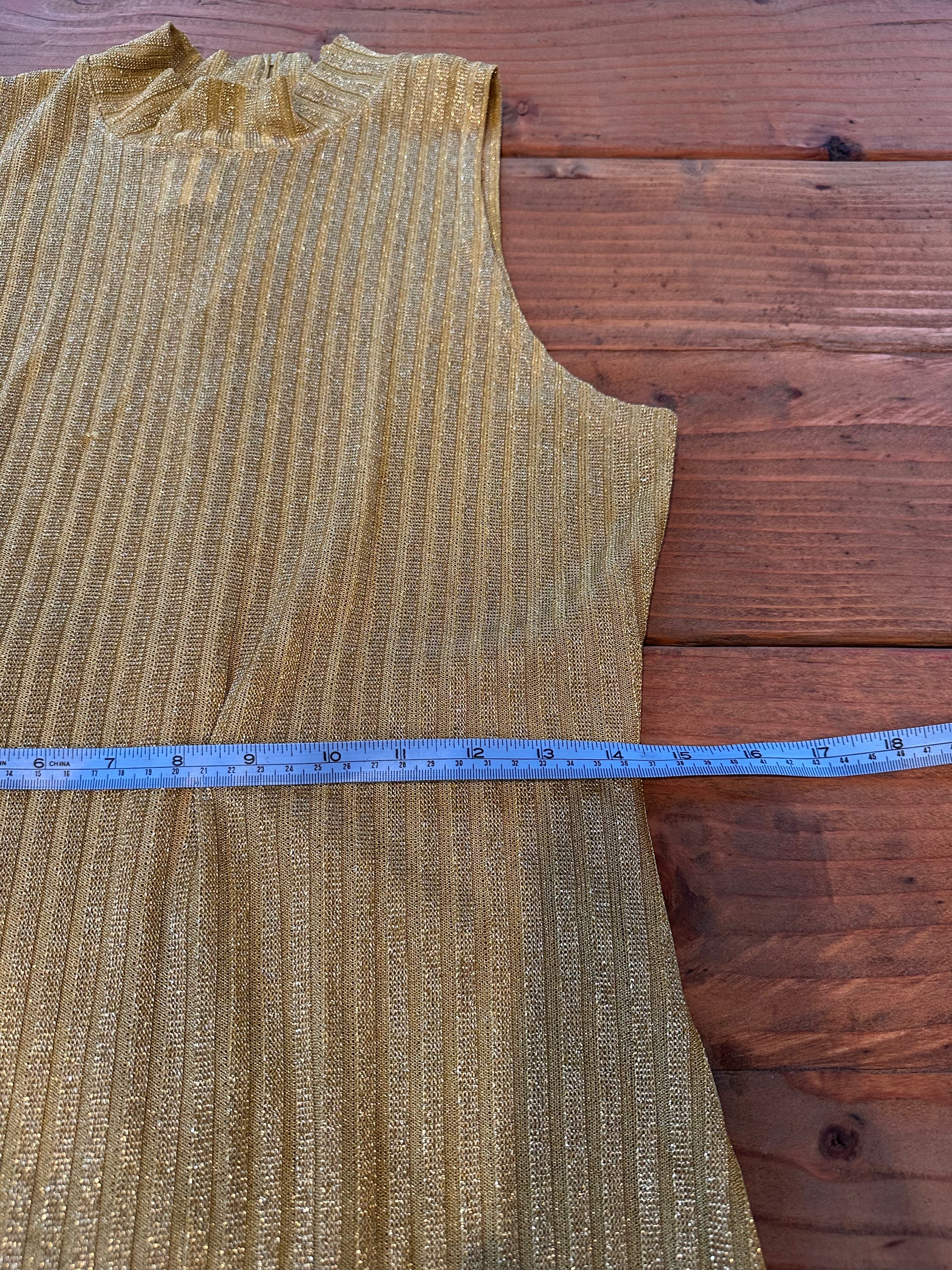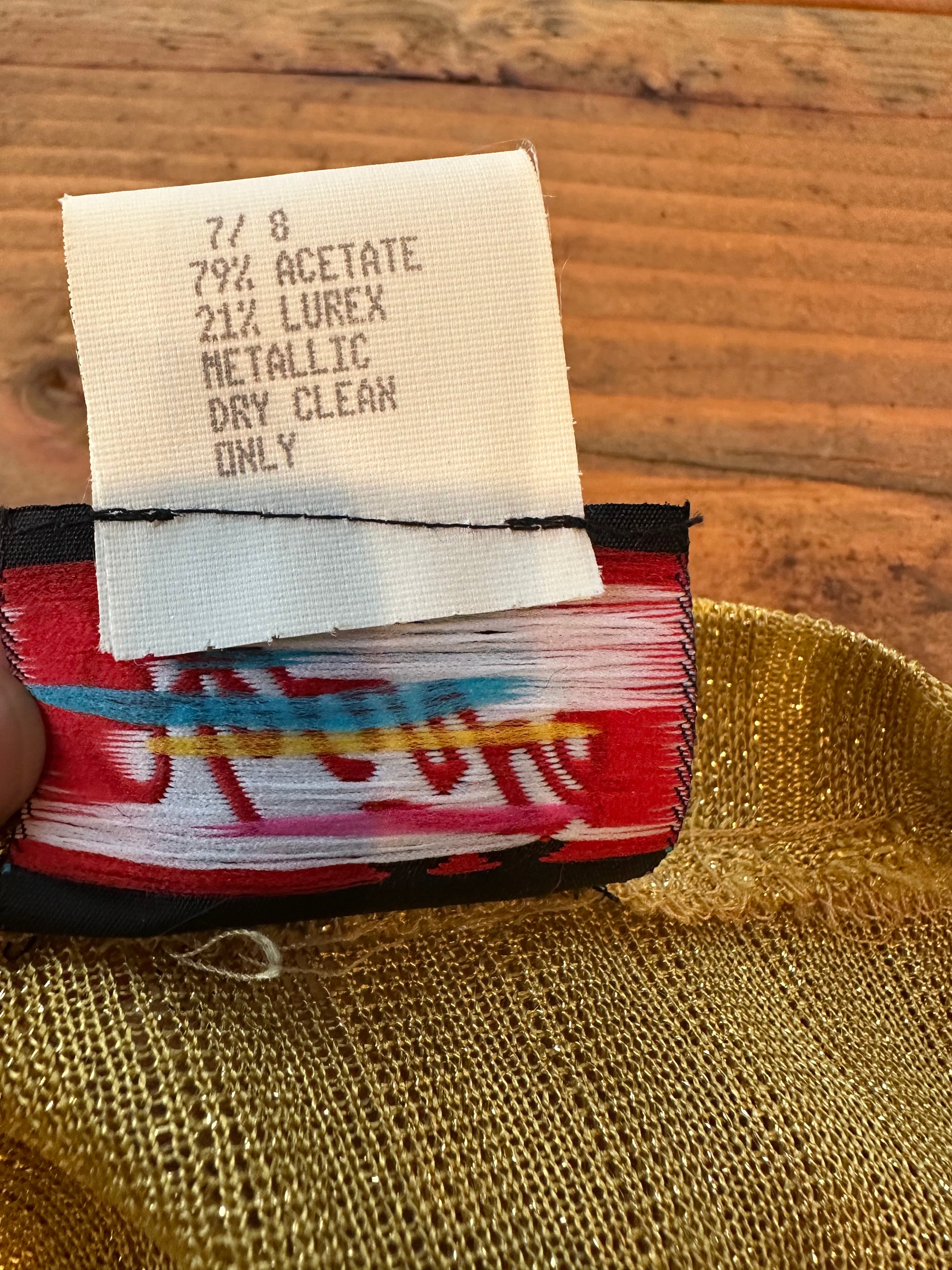 Step into the shimmer of the 1970s with this stunning vintage two-piece set from Hearts, featuring a sleeveless gold lurex ribbed knit dress and a matchint open-front cardigan. The metallic gold thread catches the light beautifully, giving the set a glamorous, disco-era glow. Wear to CBGB, or else on any night on the town. What could set off your best metallic eyeshadow better than this set?