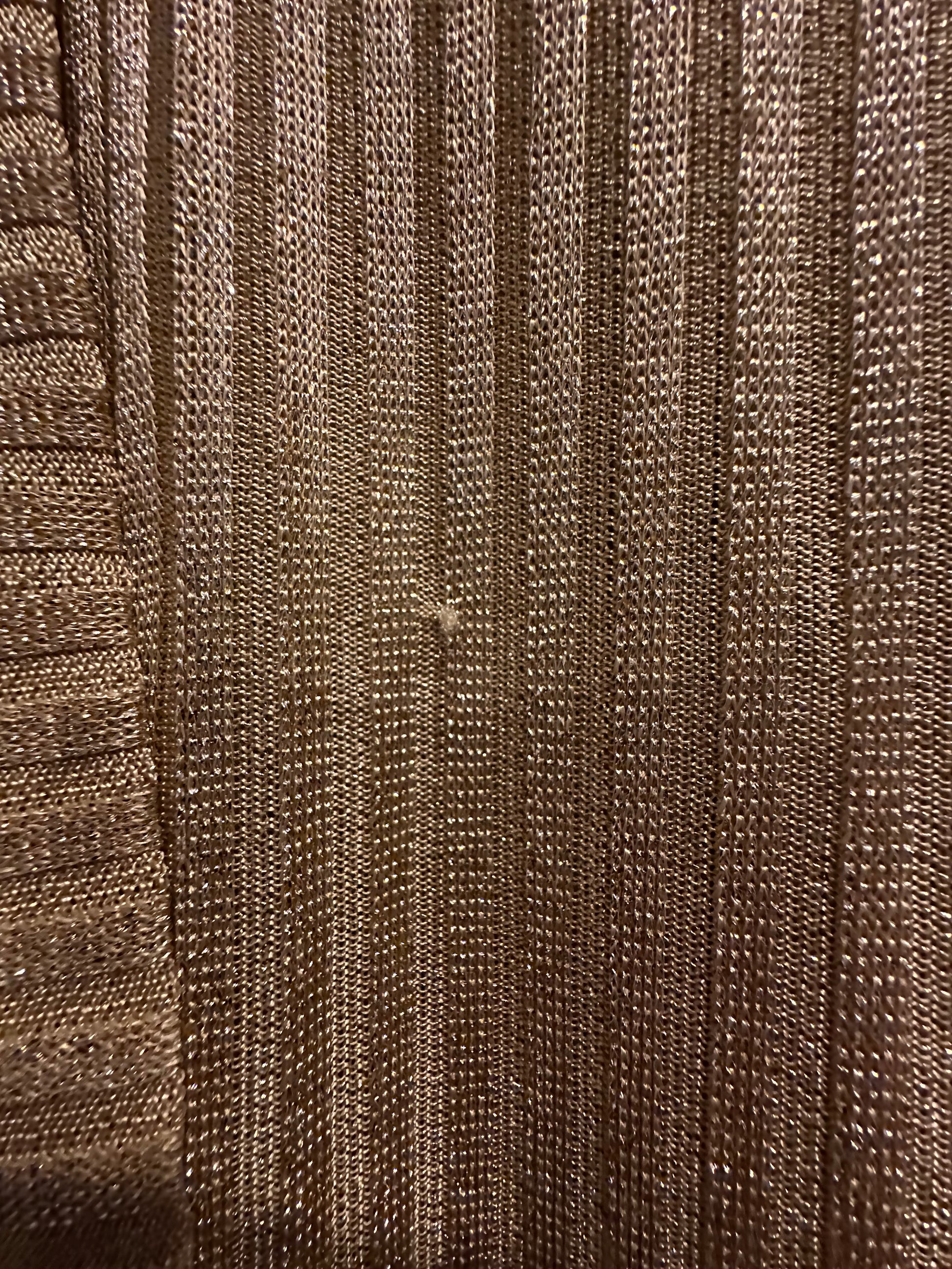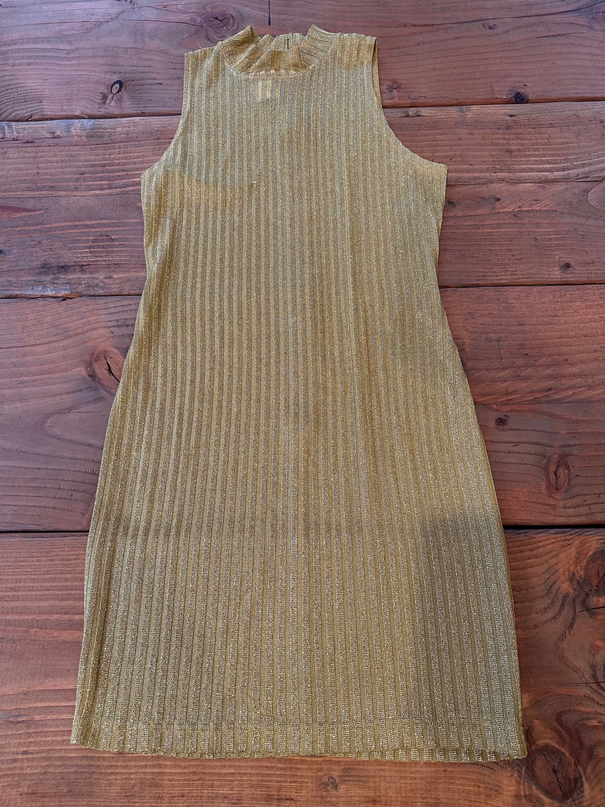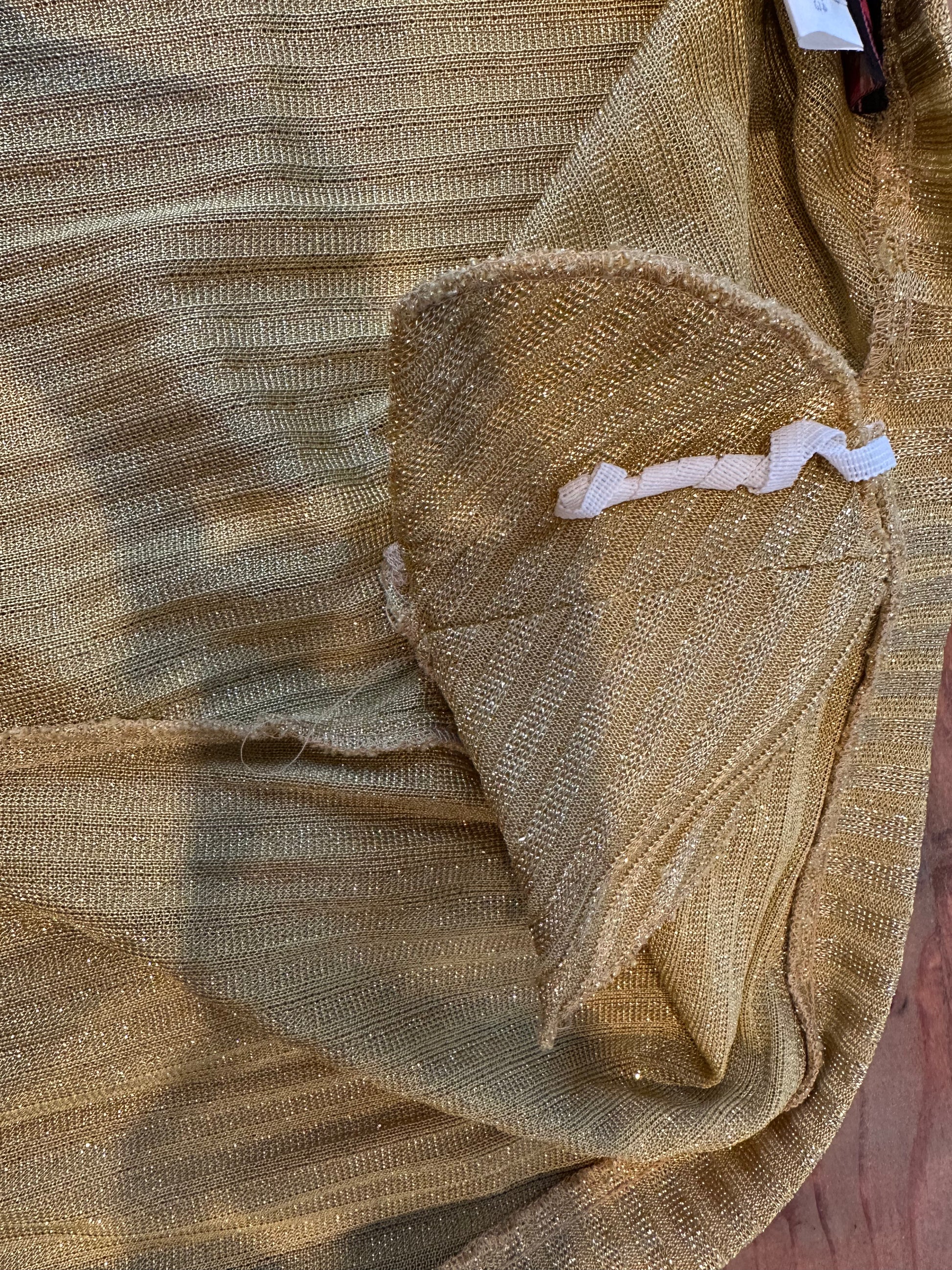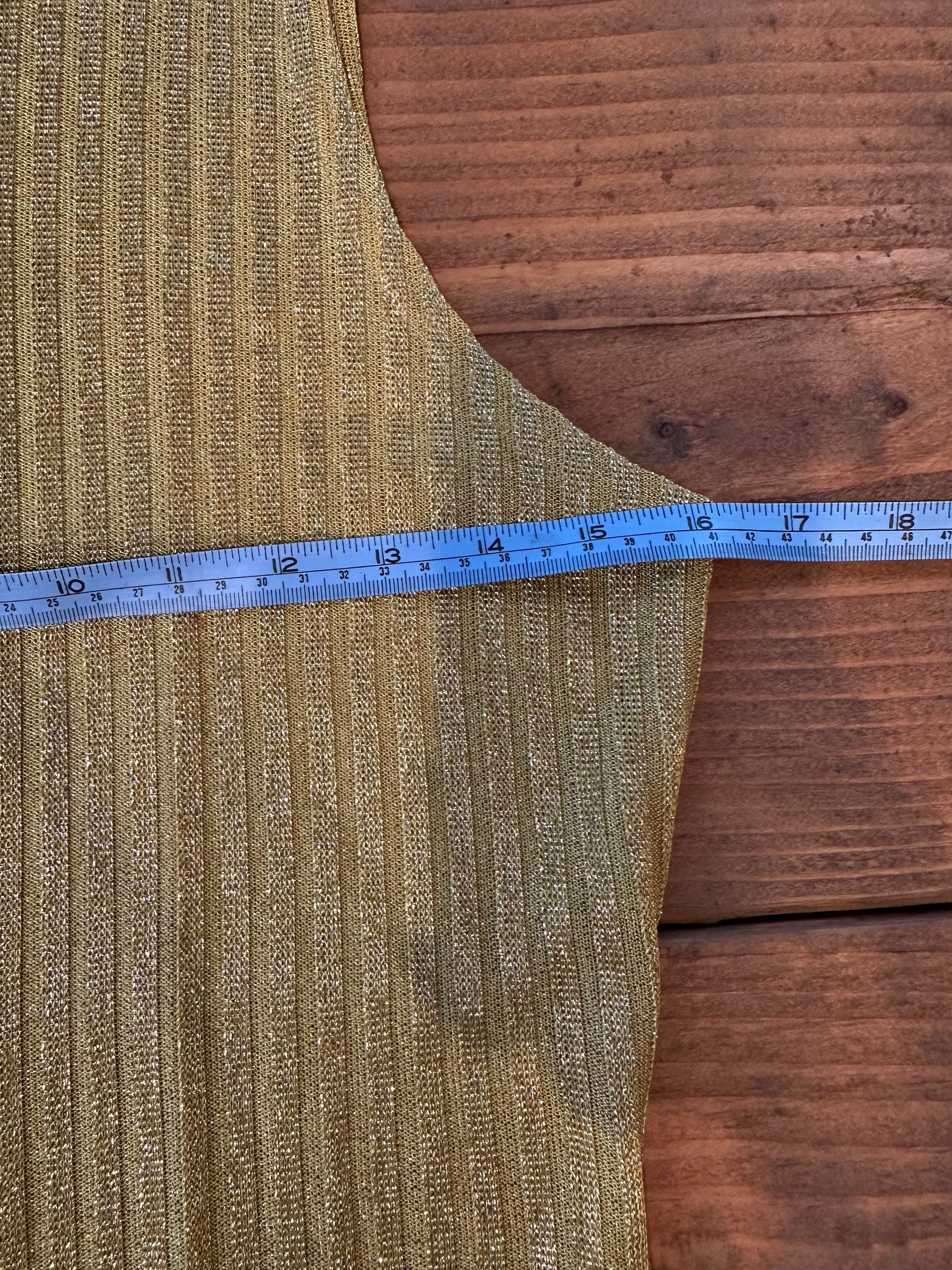 Step into the shimmer of the 1970s with this stunning vintage two-piece set from Hearts, featuring a sleeveless gold lurex ribbed knit dress and a matchint open-front cardigan. The metallic gold thread catches the light beautifully, giving the set a glamorous, disco-era glow. Wear to CBGB, or else on any night on the town. What could set off your best metallic eyeshadow better than this set?