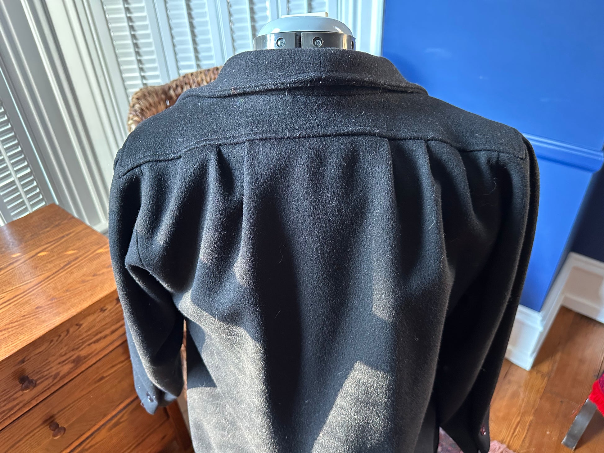 This unique 80s jacket is a real stunner. It is impeccably crafted, with quality details like the tucks at the cuffs and waist and the gathers at the back of the shoulders. It is cut short like a moto jacket, and double-breasted so it fits snug at the waist, while the top is loose like a bomber. Completely unique. No maker label but the union tag puts it in the 80s. No materials label but estimated to be a wool blend.