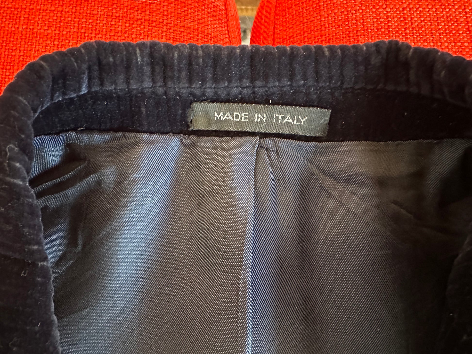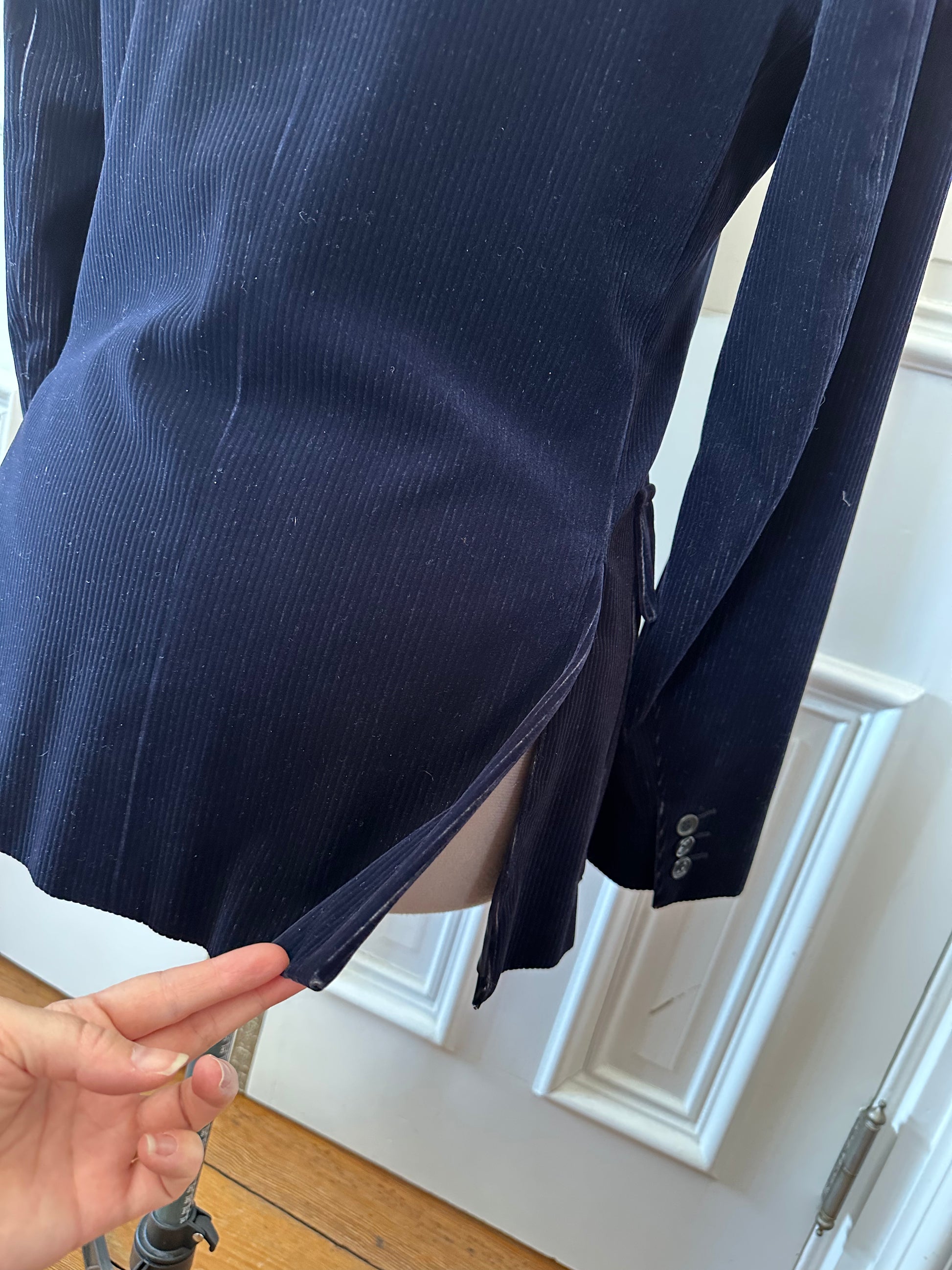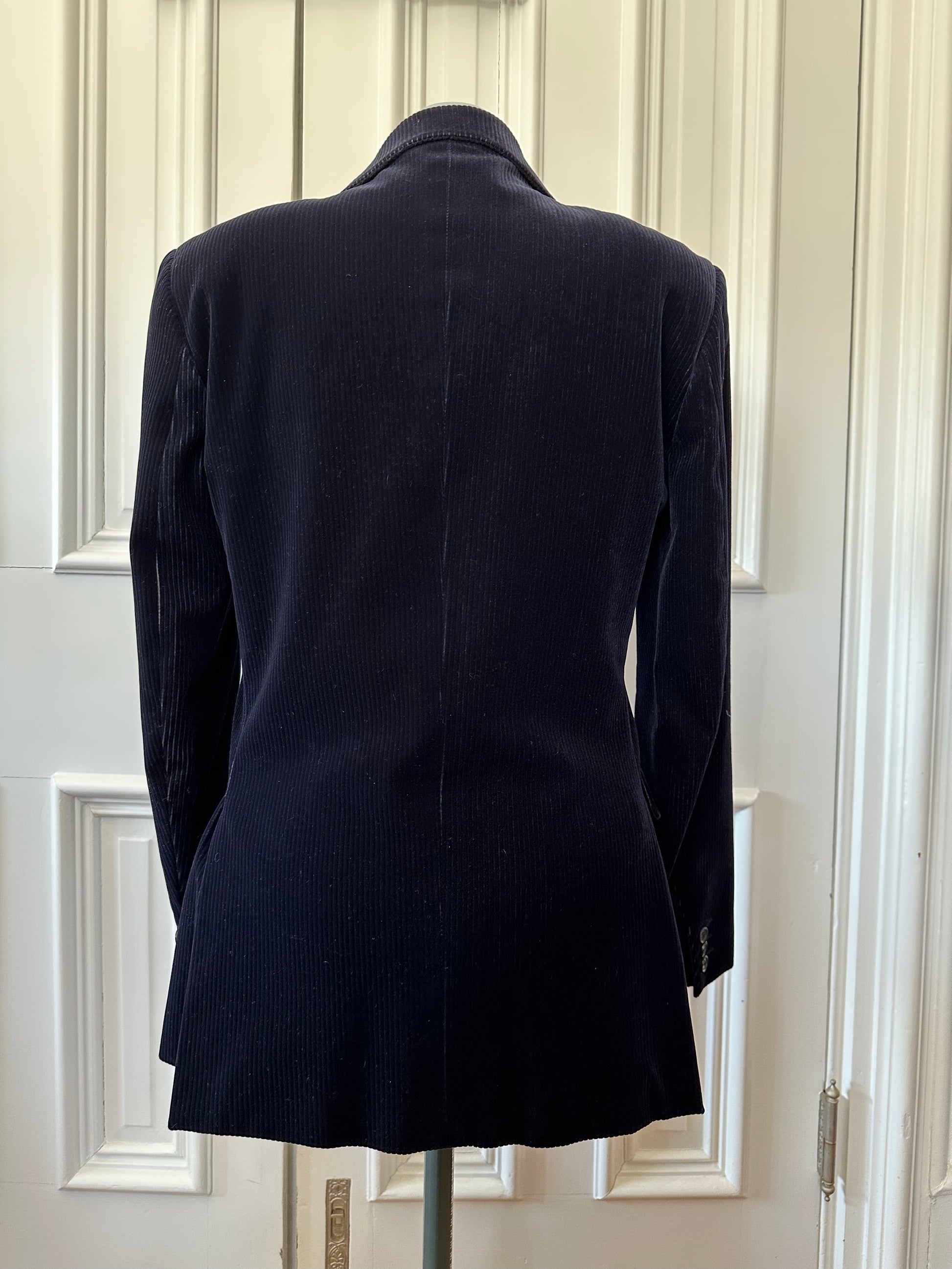 This gorgeous jacket is in a deep-blue wide-wale corduroy with a luxurious sheen. The jacket has subtle tucks to make it hug the form and will look sleek and luxe on anyone. It's from an Italian fashion house called Mediterranea. It is 17" seam-to-seam across the shoulder and about 36" in the waist. The materials label is a bit confusing, but it seems to be a cotton-viscose blend.