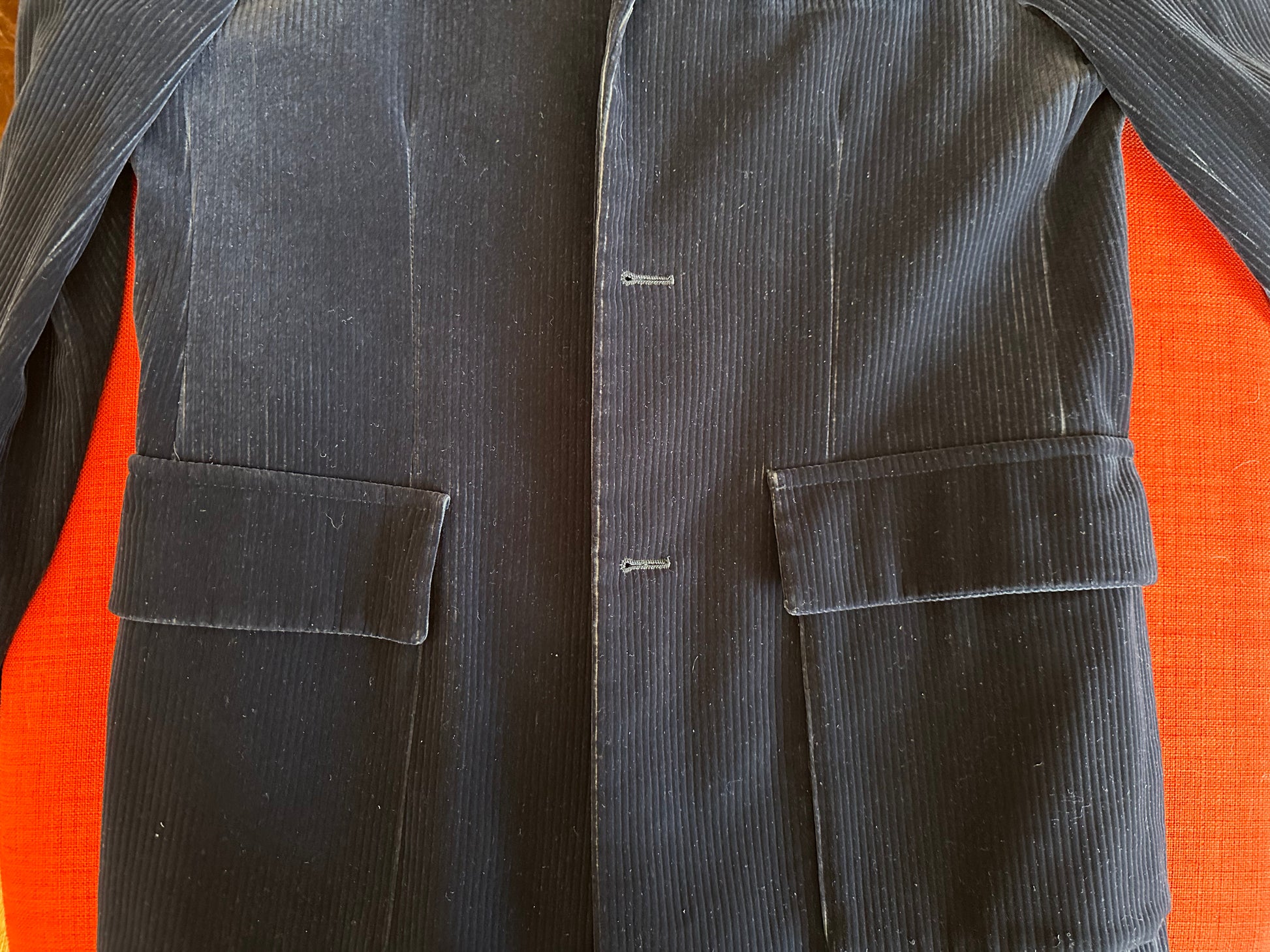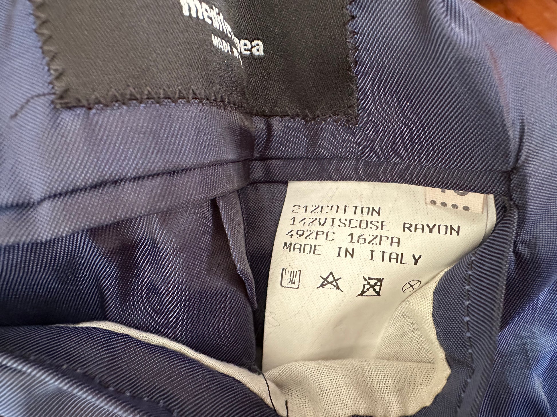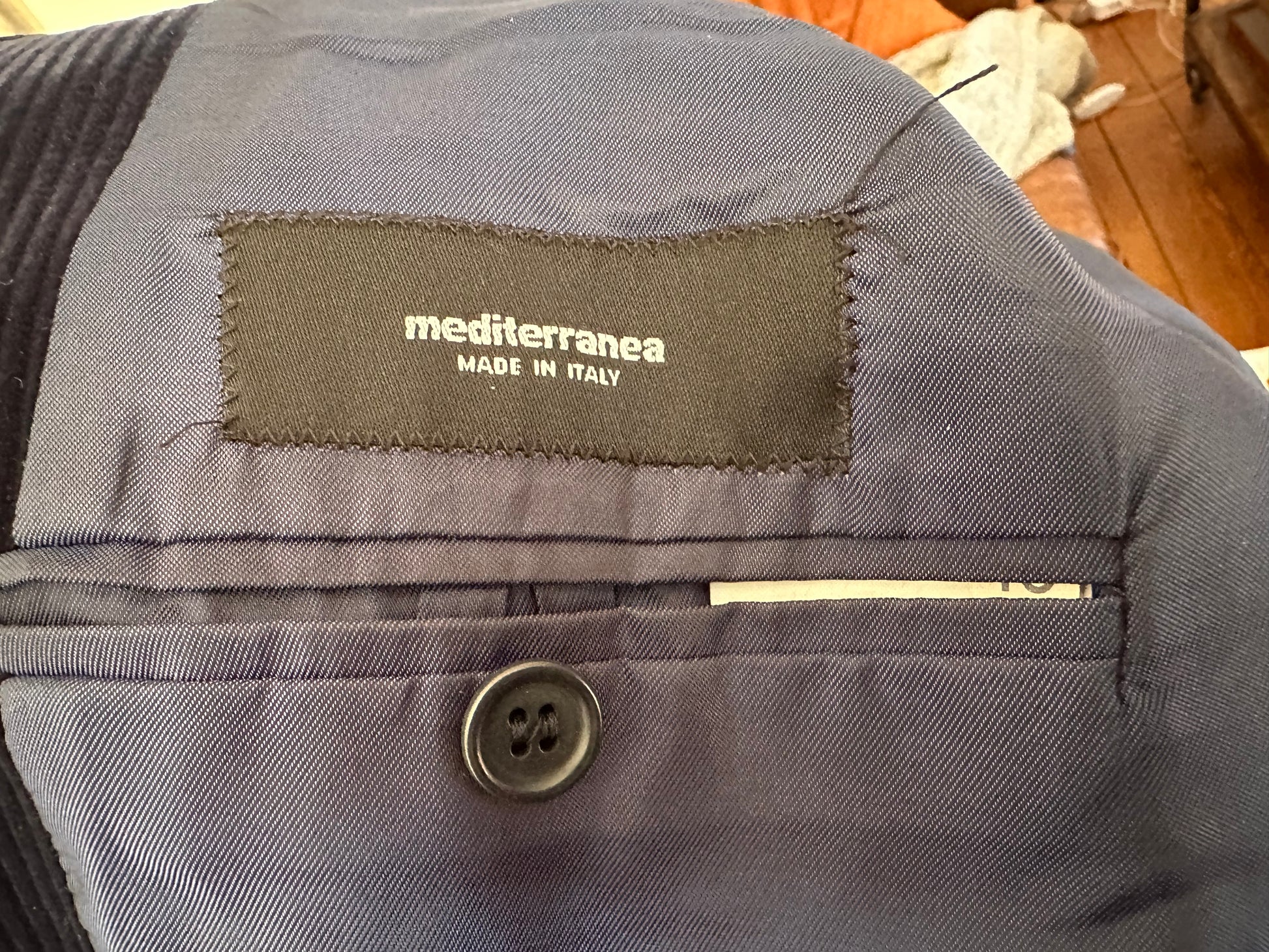 This gorgeous jacket is in a deep-blue wide-wale corduroy with a luxurious sheen. The jacket has subtle tucks to make it hug the form and will look sleek and luxe on anyone. It's from an Italian fashion house called Mediterranea. It is 17" seam-to-seam across the shoulder and about 36" in the waist. The materials label is a bit confusing, but it seems to be a cotton-viscose blend.