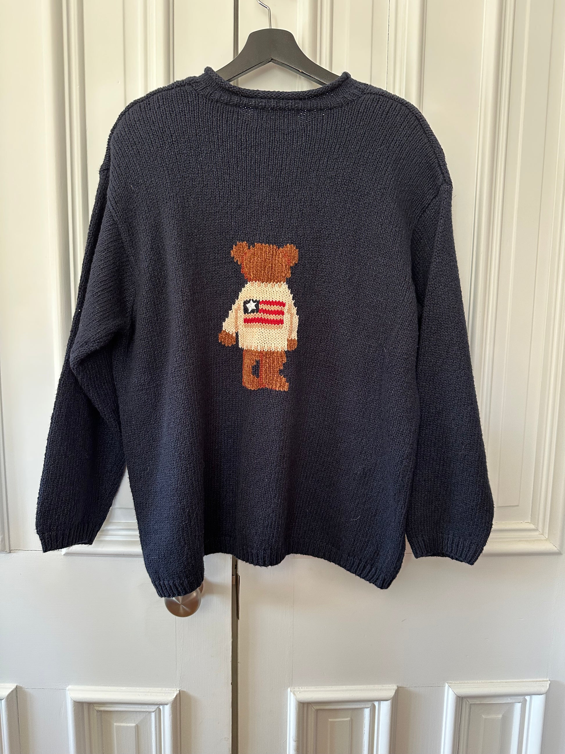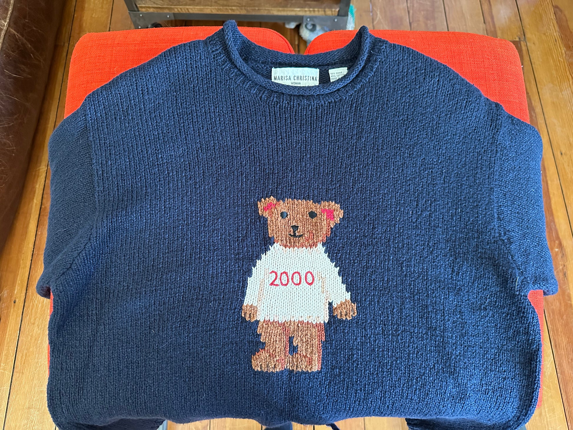This bear sweater was designed to bring in the year 2000 - part of a series by Marisa Christman, there are other "year" bears but this is the ICONIC millenium bear. The original tags were never removed, suggesting it has never been worn. It's a raimie cotton blend - 55% raimie 45% cotton. It is marked 2XL but is more likely to fit a contemporary XL, with a roomy/slouchy fit.